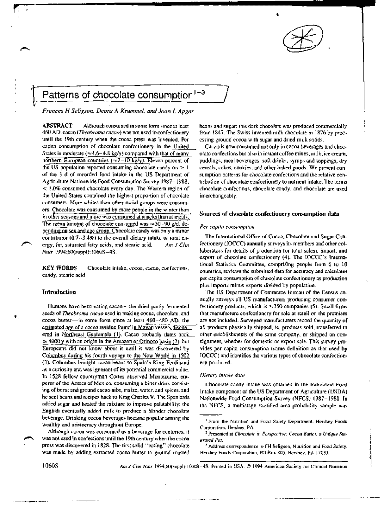 t!: ,:,.%..?17Patterns _vof chocolateconsumption3/ I IFtzinces H Seli,gson, Debra A Krummel, and Jo(in L Apgar ABSTRACTAlthoughconsumed in some form since at leastbeans and sugar; this dark chocolate