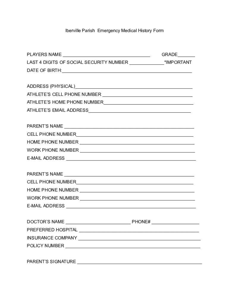 This form is designed to collect essential emergency medical history information for athletes, including personal and contact details, insurance information, and emergency contacts.