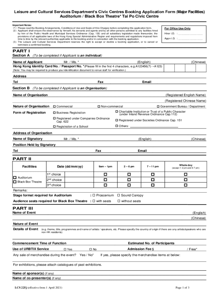 This form is to apply for booking major facilities at Tai Po Civic Centre, including the Auditorium and Black Box Theatre. It includes sections for individual and organizational applicants, details
