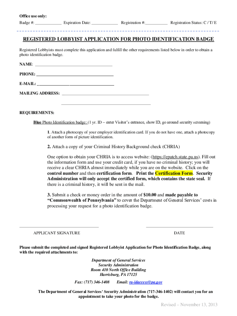 This application must be completed by registered lobbyists to obtain a photo identification badge. It requires submission of identification documents, a criminal history background check, and a processing