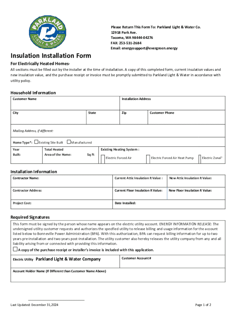 This form is to be completed by the installer at the time of insulation installation for electrically heated homes. It requires information about the household, installation details, and necessary