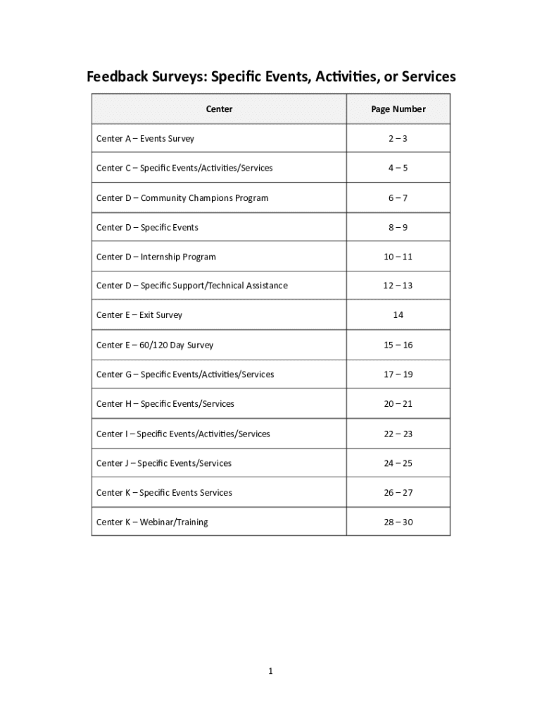 Feedback Surveys: Specic Events, Ac vi es, or Services CenterPage NumberCenter A Events Survey23Center C Specic Events/Ac vi es/Services45Center D Community Champions Program67Center D Specic Events89Center