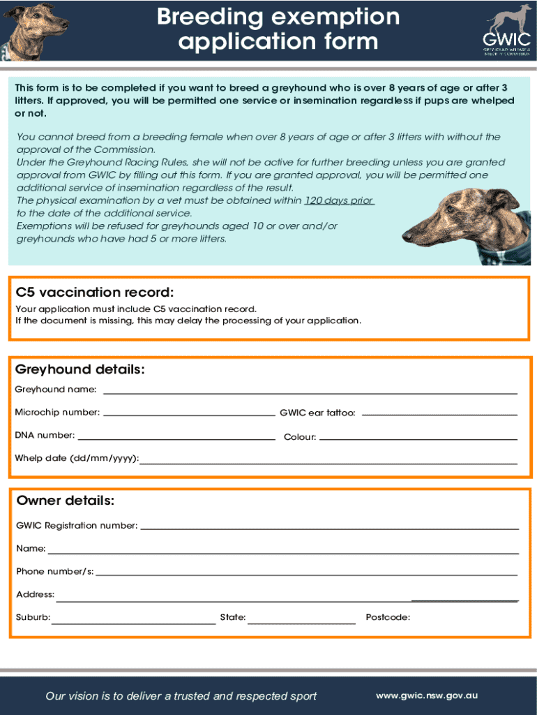Este formulario debe completarse si desea criar un galgo que tenga más de 8 años de edad o después de 3 camadas. Si se aprueba, se le permitirá un servicio o inseminación independientemente de