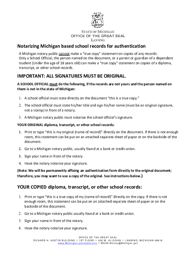 STATE OF MICHIGAN OFFICE OF THE GREAT SEAL LANSINGNotarizing Michigan based school records for authentication A Michigan notary public cannot make a true copy statement on copies of any records. Only