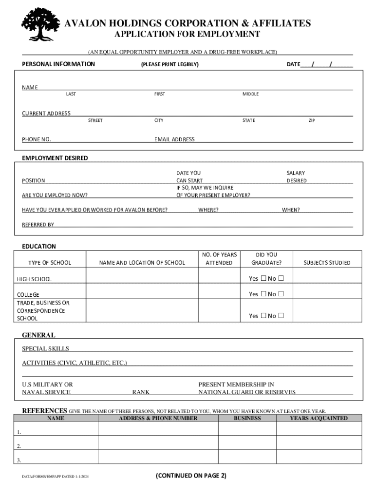 This application form is for individuals seeking employment at Avalon Holdings Corporation and its affiliates. It collects personal information, employment history, education details, and references.