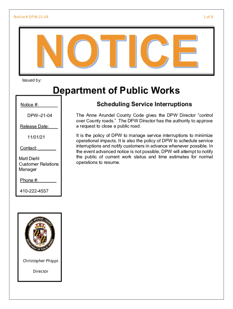 This document outlines the policies and procedures established by the Department of Public Works (DPW) for scheduling service interruptions related to public road closures. It covers the roles and