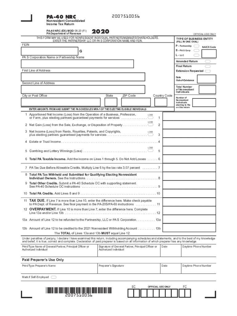 El PA-40 NRC es un formulario utilizado para combinar y reportar los ingresos (pérdidas), retenciones de impuestos de Pennsylvania y créditos de dos o más propietarios individuales no residentes