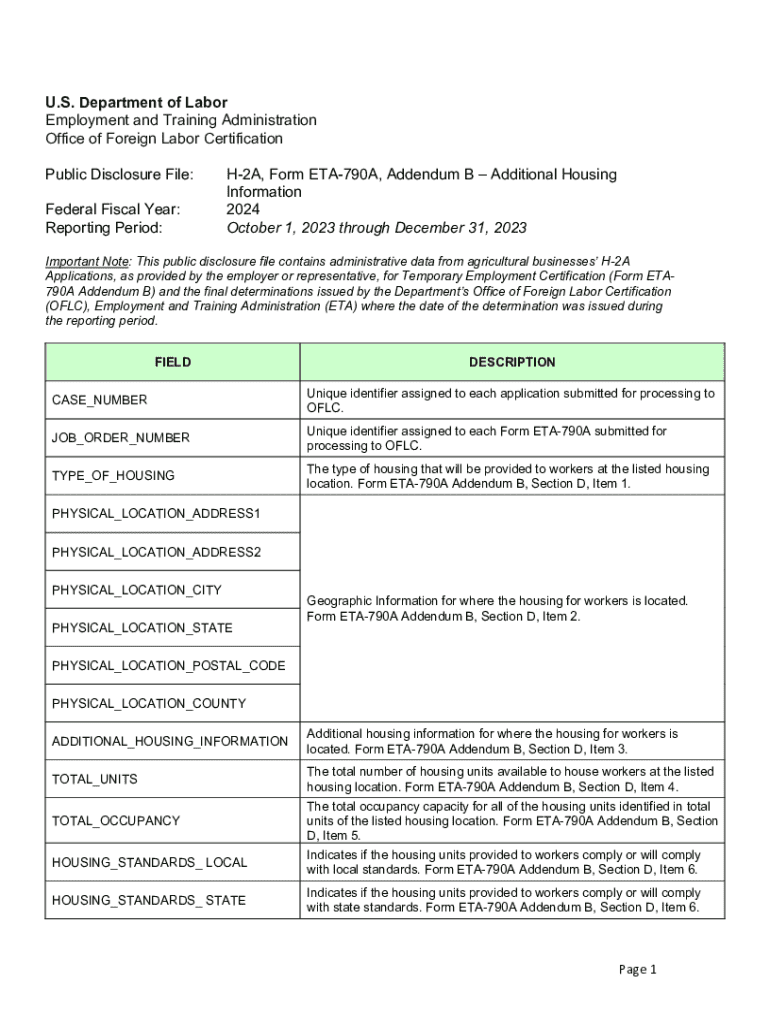 This public disclosure file contains administrative data from agricultural businesses’ H-2A Applications for Temporary Employment Certification and the final determinations issued during the reporting