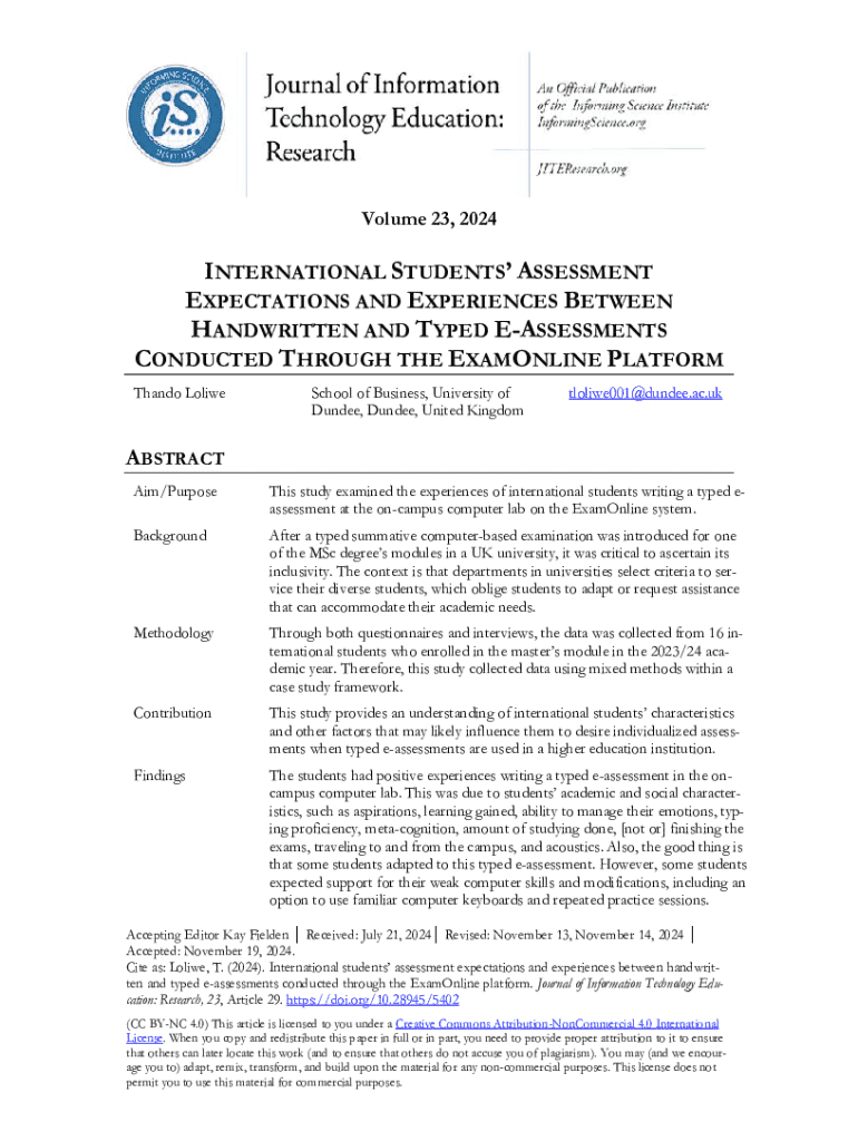 Volume 23, 2024INTERNATIONAL STUDENTS ASSESSMENT EXPECTATIONS AND EXPERIENCES BETWEEN HANDWRITTEN AND TYPED EASSESSMENTS CONDUCTED THROUGH THE EXAMONLINE PLATFORM Thando LoliweSchool of Business,