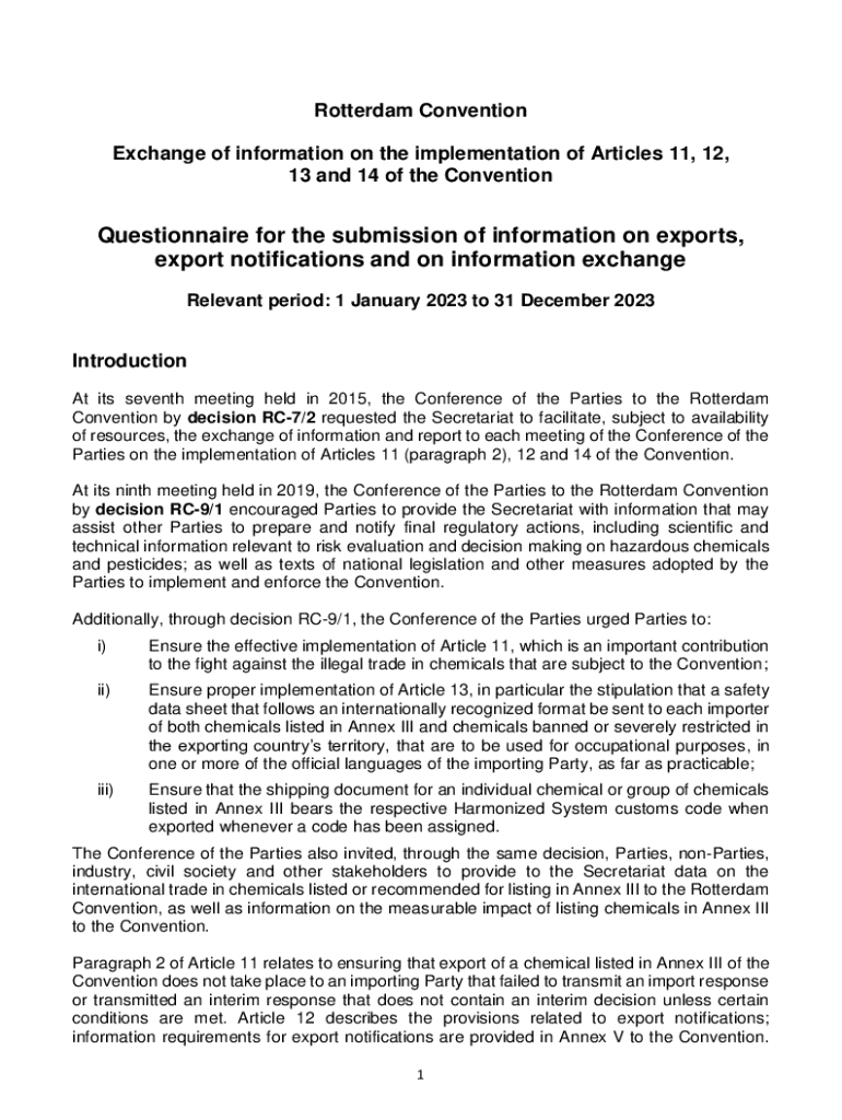 This questionnaire is designed to facilitate the submission of information on the implementation of the Rotterdam Convention, specifically focusing on Articles 11, 12, 13, and 14, for the relevant