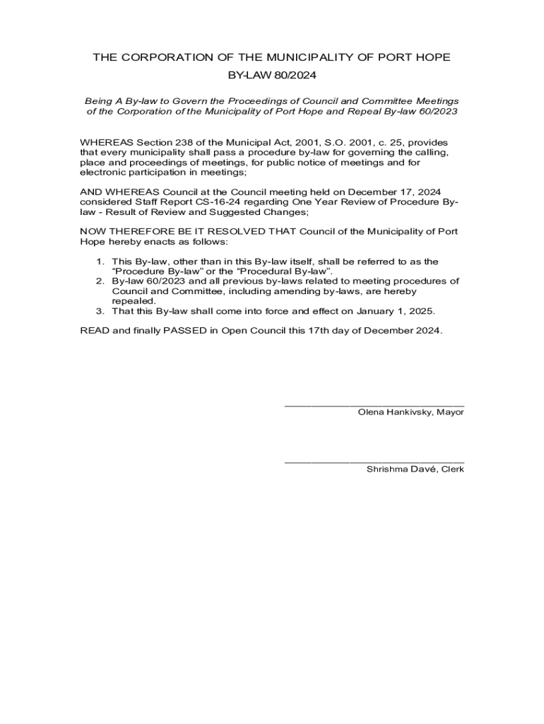 This by-law outlines the procedures for conducting Council and Committee meetings in the Municipality of Port Hope. It includes provisions for meeting procedures, roles and responsibilities of Council