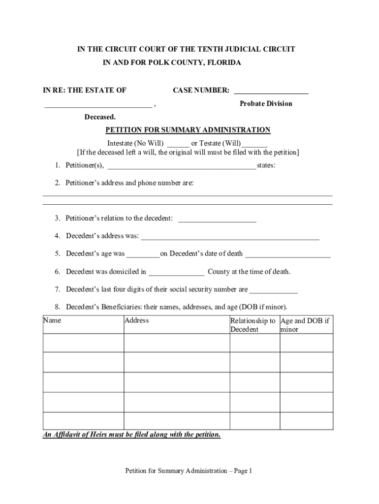 Este formulario se utiliza para solicitar la administración sumaria de la herencia de una persona fallecida en el condado de Polk, Florida, ya sea intestada o testada. Incluye información sobre
