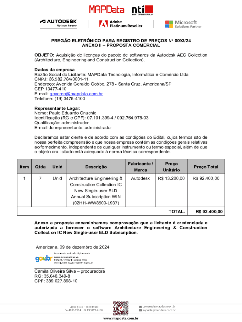 PREGO ELETRNICO PARA REGISTRO DE PREOS N 0093/24 ANEXO II PROPOSTA COMERCIAL OBJETO: Aquisio de licenas do pacote de softwares da Autodesk AEC Collection (Architecture, Engineering and Construction