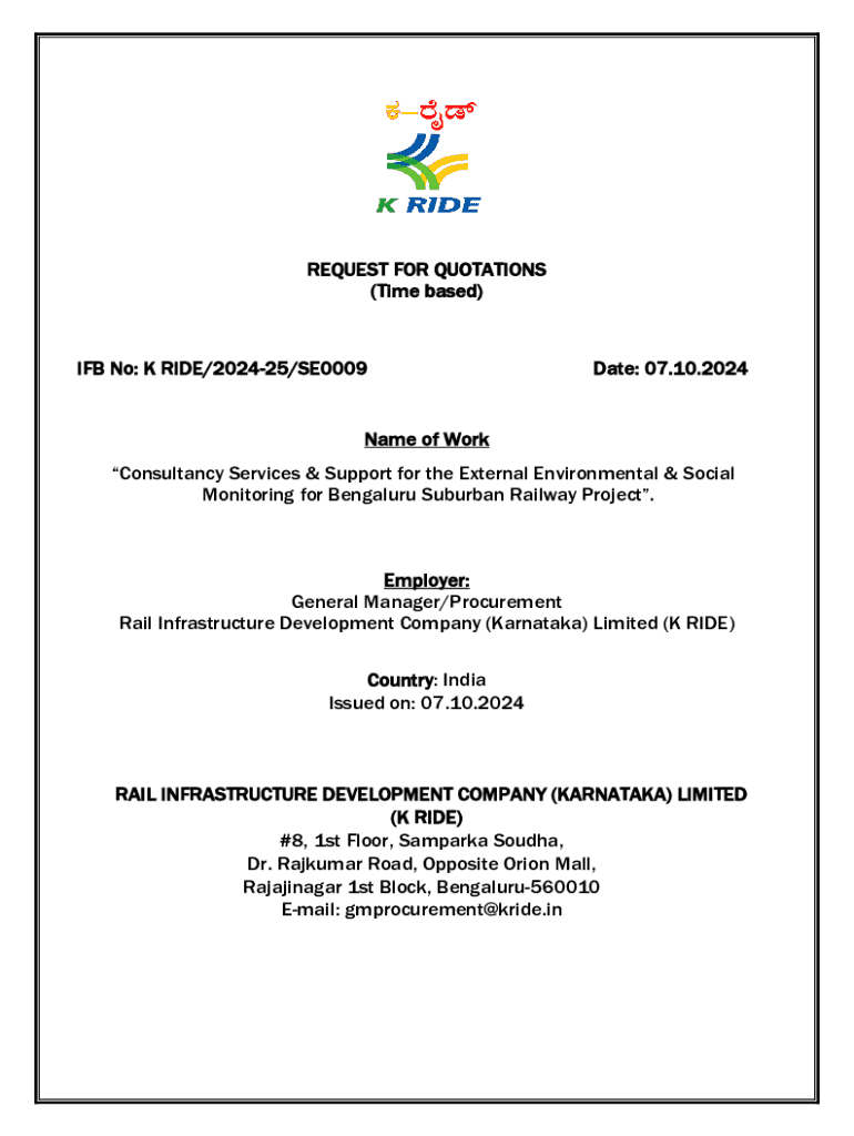 This document serves as a formal request for quotations for consultancy services related to external environmental and social monitoring for the Bengaluru Suburban Railway Project. It outlines the