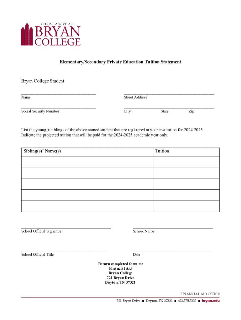 This document is used to report tuition information for a student attending Bryan College, including details about younger siblings registered for the academic year 2024-2025.