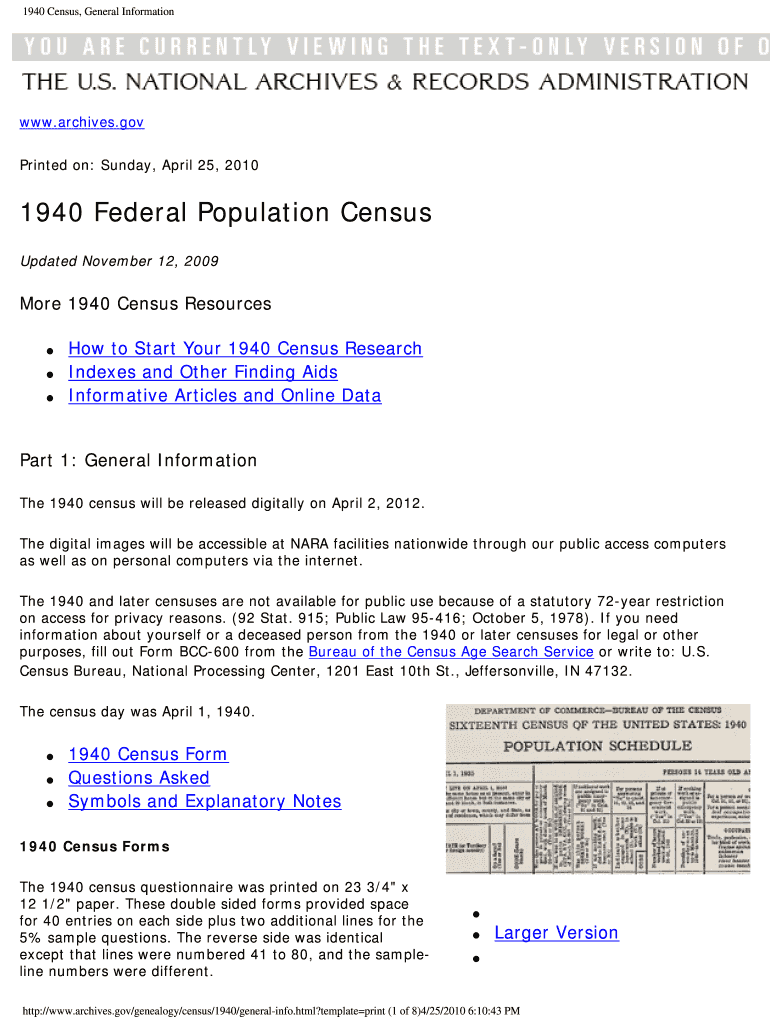1940 Census, General Information.archives.gov Printed on: Sunday, April 25, 20101940 Federal Population Census Updated November 12, 2009More 1940 Census Resources How to Start Your 1940 Census Research