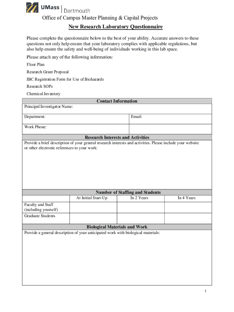 New research laboratories that are seeking funding, partnership, or compliance with research regulatory bodies are typically required to file the new research laboratory questionnaire.
