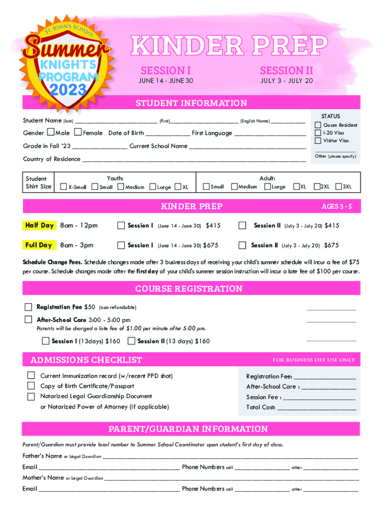hns Sch . Jo oo St lSESSION ISESSION IIJUNE 14 JUNE 30JULY 3 JULY 20STUDENT INFORMATION Student Name (last) ___ (first)___ (English Name) ___ GenderMaleFemale Date of Birth ___ First Language ___Grade