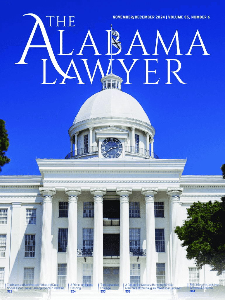 This issue discusses various topics relevant to the legal community in Alabama, including demographic trends among lawyers, estate planning, judicial system updates, and key events within the Alabama