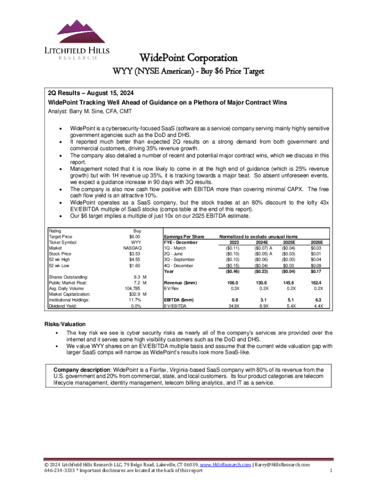 WidePoint Corporation WYY (NYSE American) Buy $6 Price Target 2Q Results August 15, 2024 WidePoint Tracking Well Ahead of Guidance on a Plethora of Major Contract Wins Analyst: Barry M. Sine, CFA,