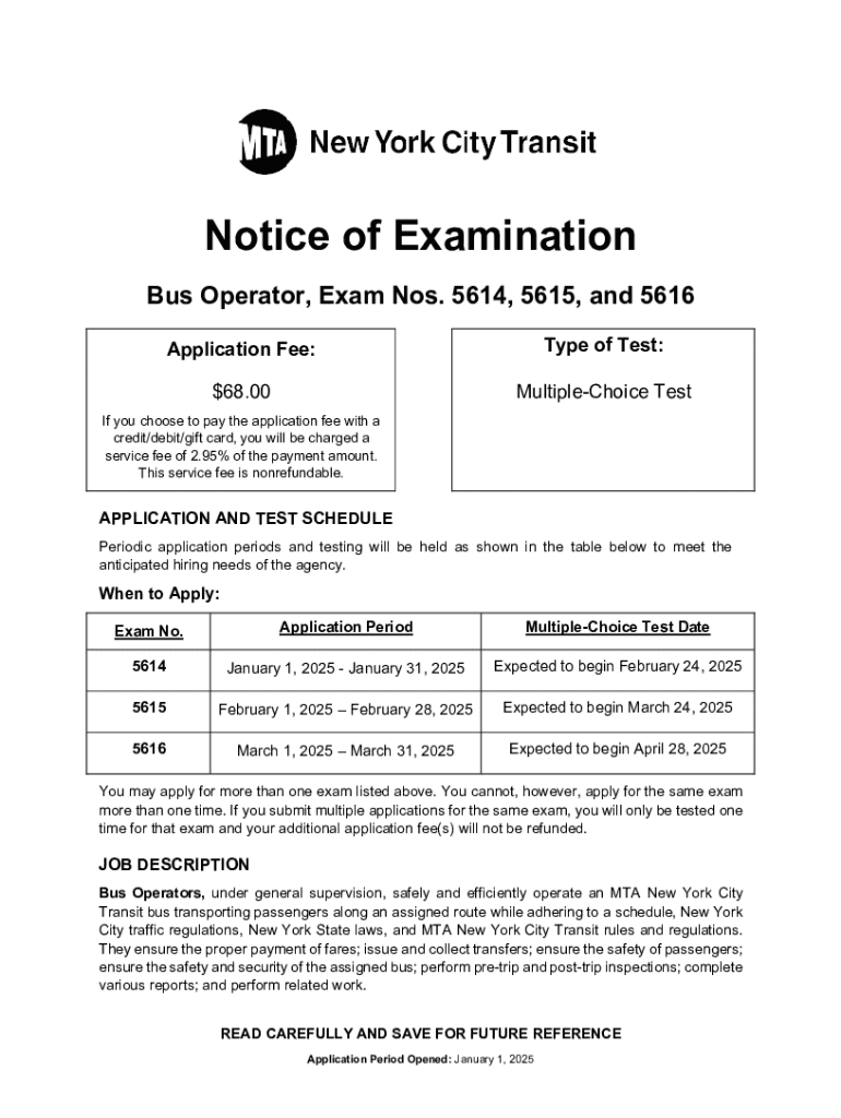 This notice outlines the application process, testing schedule, and job requirements for the Bus Operator position within MTA New York City Transit. It details the application fees, examination dates,