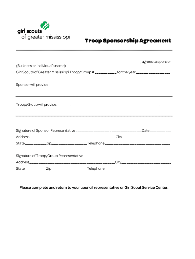 Este documento es un acuerdo de patrocinio para el Troop/Grupo de Girl Scouts de Greater Mississippi, donde un patrocinador se compromete a apoyar al grupo durante un año específico.