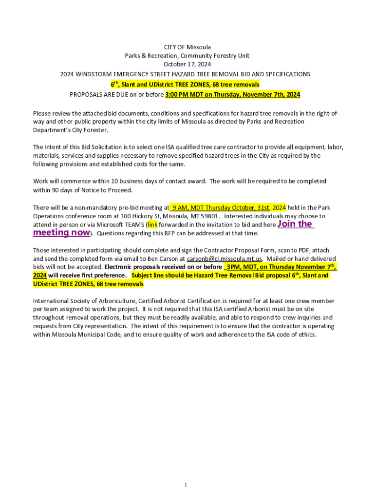 Este documento establece los requisitos para la remoción de árboles de peligro debido a una tormenta de viento en la ciudad de Missoula. Se solicitan propuestas de contratistas calificados para