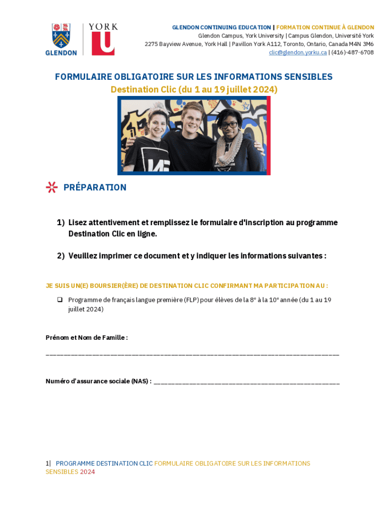 Ce formulaire est requis pour les participants au programme Destination Clic, qui se déroule du 1 au 19 juillet 2024. Les candidats doivent fournir des informations personnelles ancrées dans le