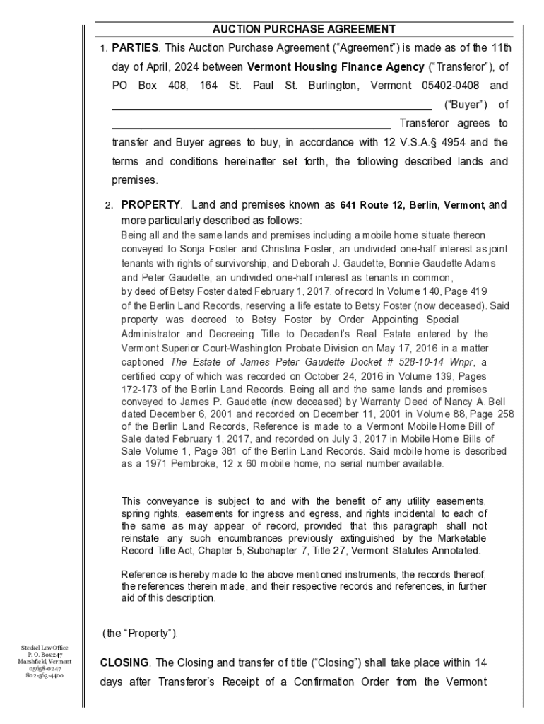 This document outlines the agreement between the Vermont Housing Finance Agency and the Buyer regarding the purchase of the property located at 641 Route 12, Berlin, Vermont. It includes details about