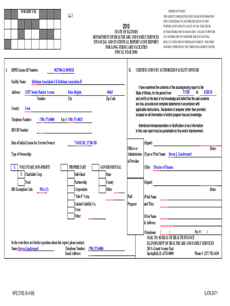 This document is a financial and statistical report for long-term care facilities in the State of Illinois, detailing the costs and statistical data for the fiscal year 2010. It includes certification