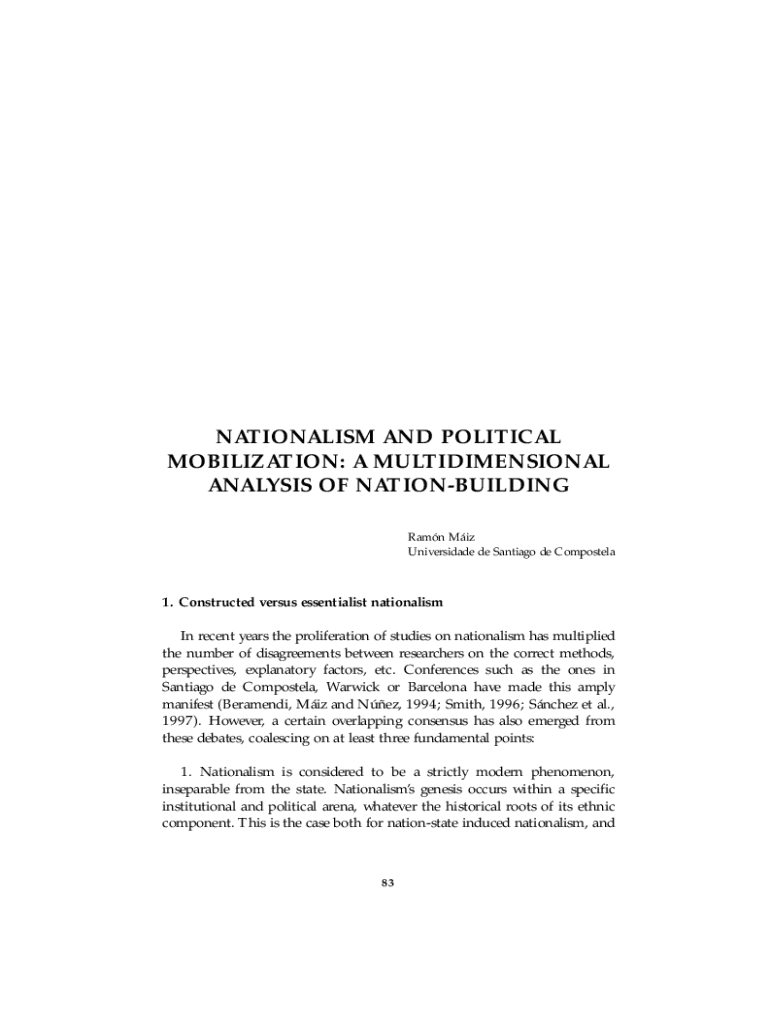 NATIONALISM AND POLITICAL MOBILIZATION: A MULTIDIMENSIONAL ANALYSIS OF NATIONBUILDING Ramn Miz Universidade de Santiago de Compostela1. Constructed versus essentialist nationalism In recent years
