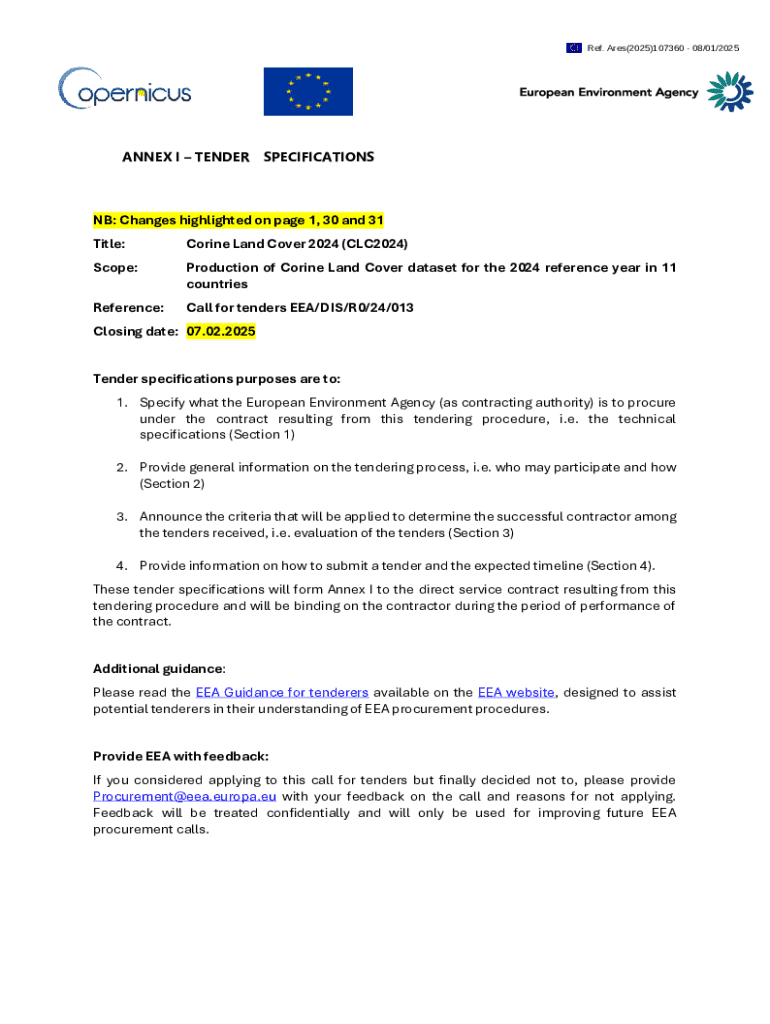 Ref. Ares(2025)107360 08/01/2025ANNEX I TENDER SPECIFICATIONSNB: Changes highlighted on page 1, 30 and 31 Title:Corine Land Cover 2024 (CLC2024)Scope:Production of Corine Land Cover dataset for the
