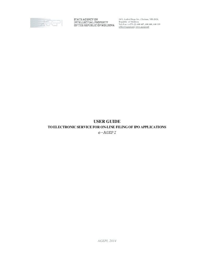 24/1, Andrei Doga Str., Chsinau, MD2024, Republic of Moldova Tel./Fax: (+37322) 400 607, 400 608, 440 119 office@agepi.md, www.agepi.mdUSER GUIDE TO ELECTRONIC SERVICE FOR ONLINE FILING OF IPO APPLICATIONSeAGEPIAGEPI,
