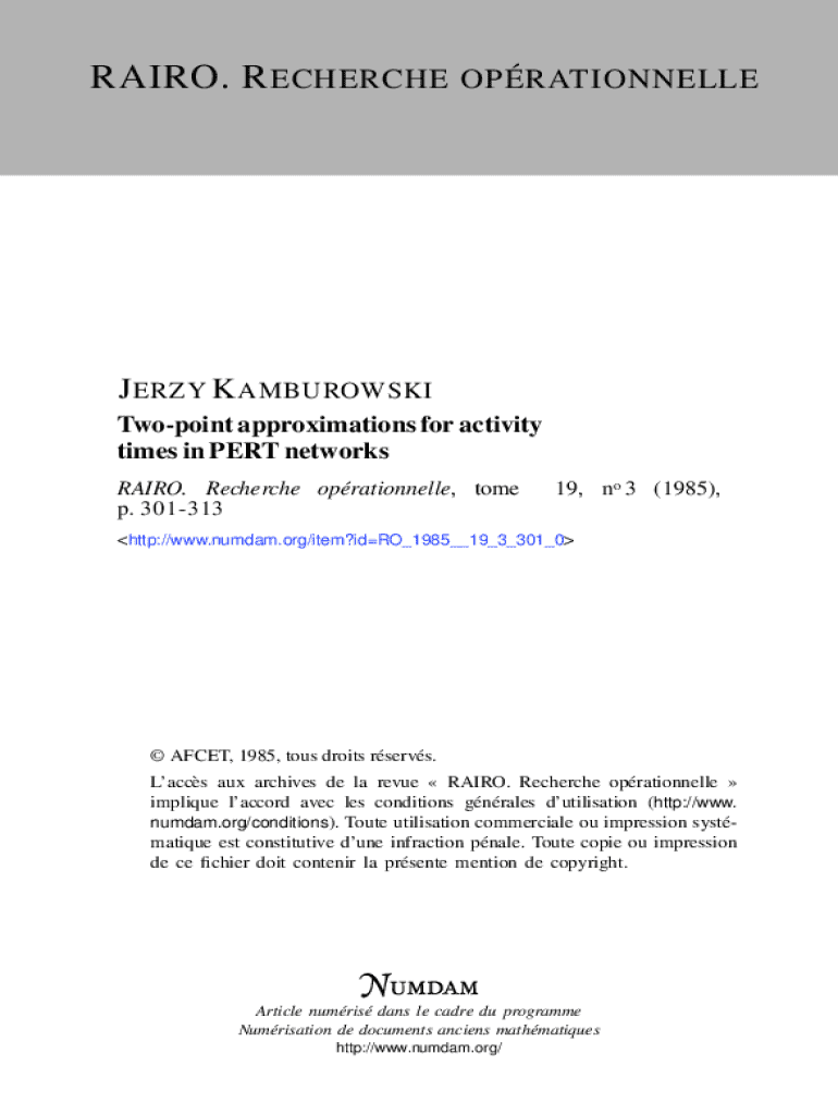 RAIRO. R ECHERCHE OPRATIONNELLEJ ERZY K AMBUROWSKI Twopoint approximations for activity times in PERT networks RAIRO. Recherche oprationnelle, tome p. 30131319, no 3 (1985),http://www.numdam.org/item?idRO_1985__19_3_301_0