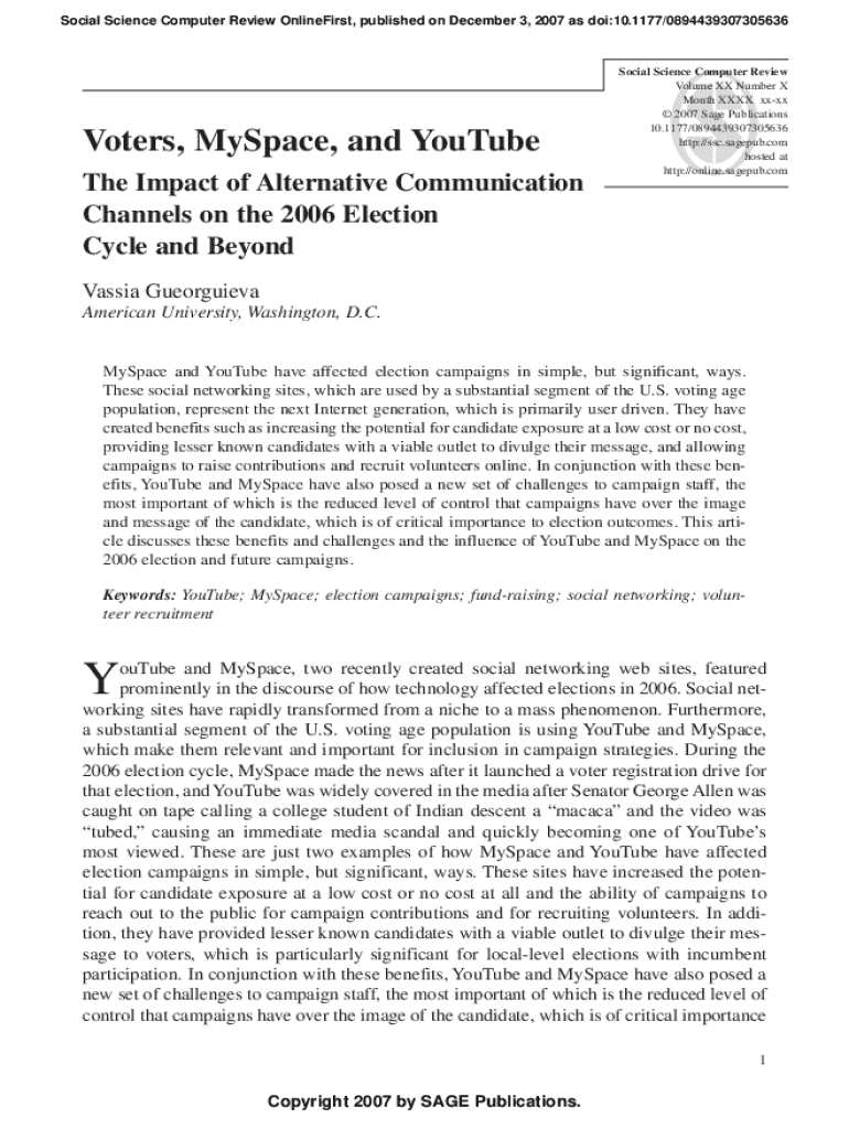 Social Science Computer Review OnlineFirst, published on December 3, 2007 as doi:10.1177/0894439307305636Voters, MySpace, and YouTube The Impact of Alternative Communication Channels on the 2006 Election