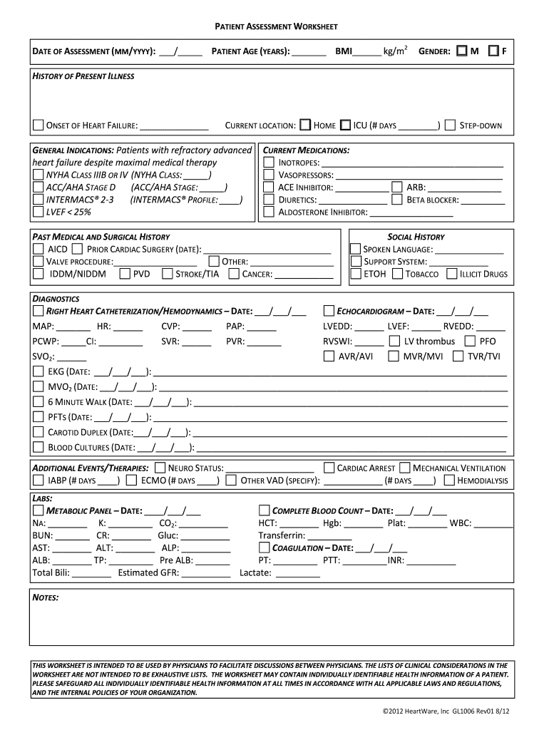 PATIENT ASSESSMENT WORKSHEET DATE OF ASSESSMENT (MM/YYY): / PATIENT AGE (YEARS): BMI kg/m2 GENDER: M F HISTORY OF PRESENT ILLNESS ONSET OF HEART FAILURE: CURRENT LOCATION: GENERAL INDICATIONS: Patients