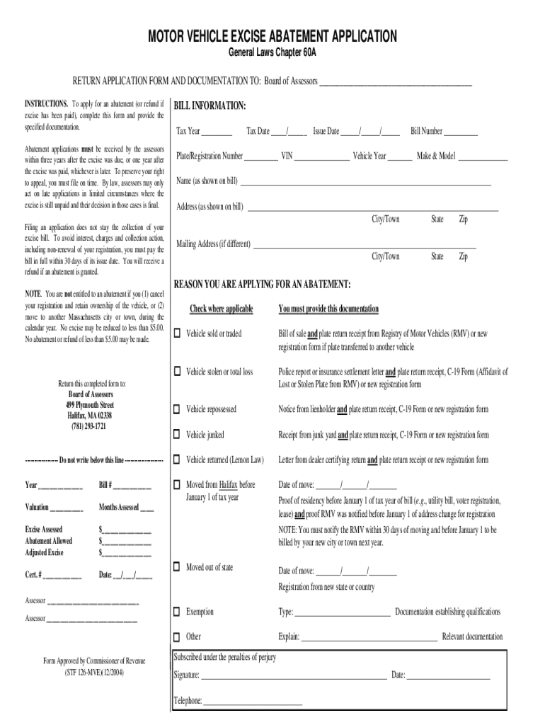 Obtain the Motor Vehicle Excise Abatement application form from your local tax authority or their website.