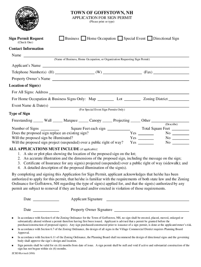 This document serves as an application for obtaining a sign permit in the Town of Goffstown, NH. It outlines the necessary information and requirements for businesses, home occupations, special events,