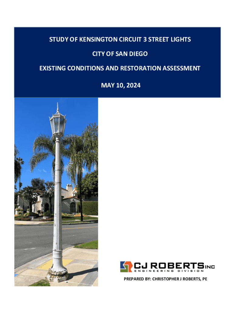 Este informe documenta la investigación realizada sobre la condición existente y la evaluación de la restauración de las luces de la calle en el Circuito 3 de Kensington, San Diego. El estudio