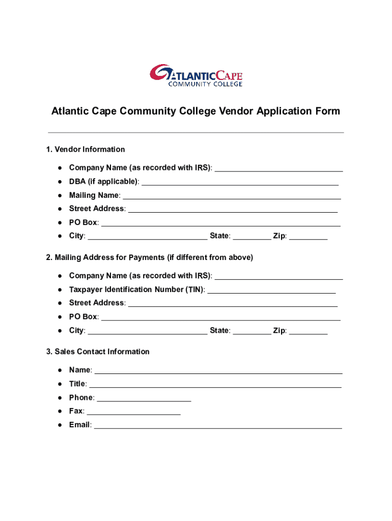 Este formulario se utiliza para que los proveedores se registren y envíen su información a Atlantic Cape Community College, incluyendo detalles sobre la empresa, información de contacto y certificaciones.