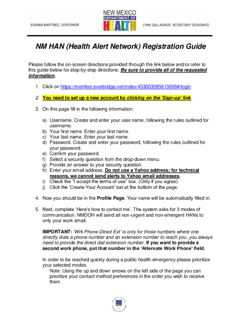 This guide provides step-by-step instructions for registering for the New Mexico Health Alert Network, including setting up an account and entering necessary information.