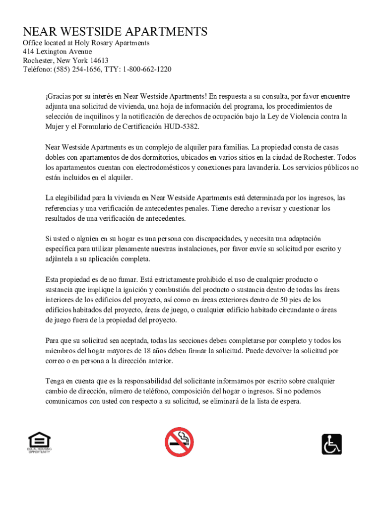 Formulario de solicitud para la residencia en Near Westside Apartments, que incluye detalles sobre la elegibilidad, requisitos de información y procedimientos de selección de inquilinos. Este documento