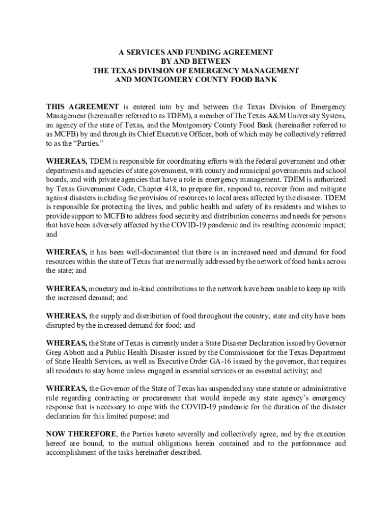 Este acuerdo establece los términos y condiciones bajo los cuales la División de Manejo de Emergencias de Texas (TDEM) proporcionará apoyo y financiamiento a Montgomery County Food Bank (MCFB)