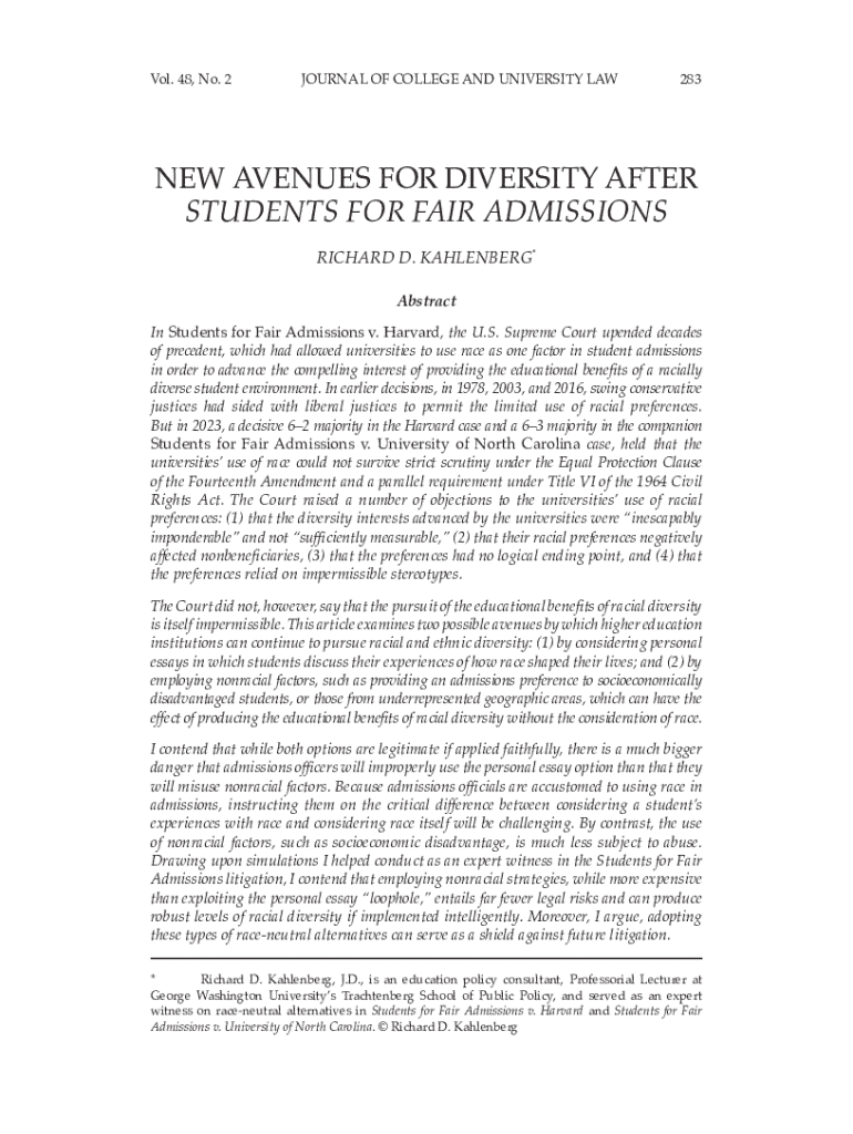 Vol. 48, No. 2JOURNAL OF COLLEGE AND UNIVERSITY LAW283NEW AVENUES FOR DIVERSITY AFTER STUDENTS FOR FAIR ADMISSIONS RICHARD D. KAHLENBERG* Abstract In Students for Fair Admissions v. Harvard, the U.S.