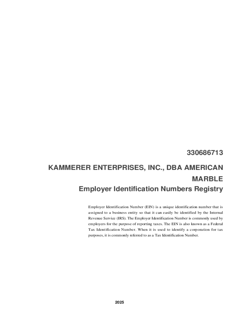 330686713 KAMMERER ENTERPRISES, INC., DBA AMERICAN MARBLE Employer Identification Numbers Registry Employer Identification Number (EIN) is a unique identification number that is assigned to a business