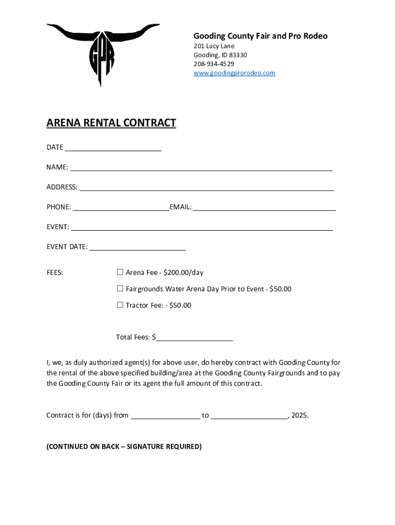 This document is a rental contract for the arena facilities at the Gooding County Fairgrounds, outlining fees, responsibilities for upkeep, insurance requirements, and compliance with laws for events