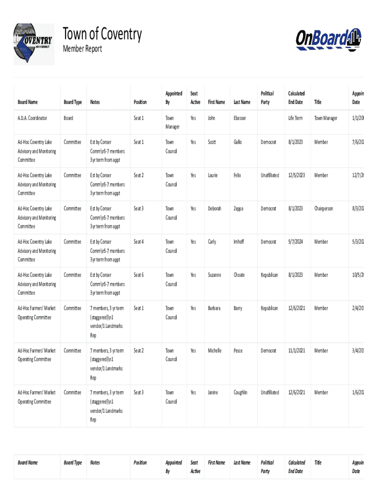 Town of Coventry Member ReportAppointed BySeat ActiveFirst NameLast NameCalculated End DateTitleAppoin DateSeat 1Town ManagerYesJohnElsesserLife TermTown Manager1/1/200Est by Conser Commn57 members