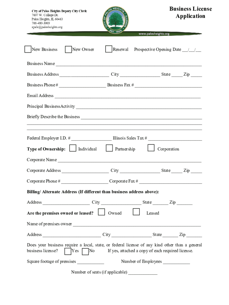 This document is a comprehensive application form for obtaining a business license in the City of Palos Heights. It includes information about the business owner, type of business, business location,