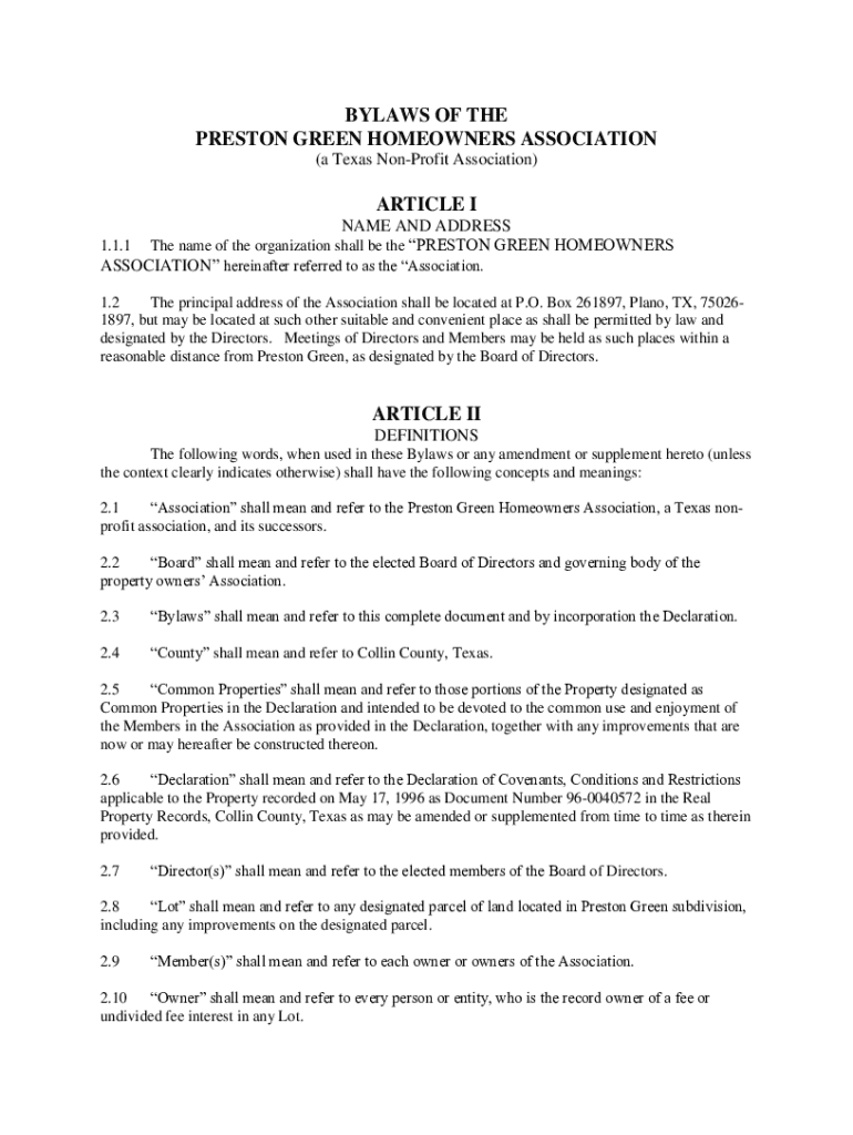 Get the free Bylaws of the Preston Green Homeowners Association