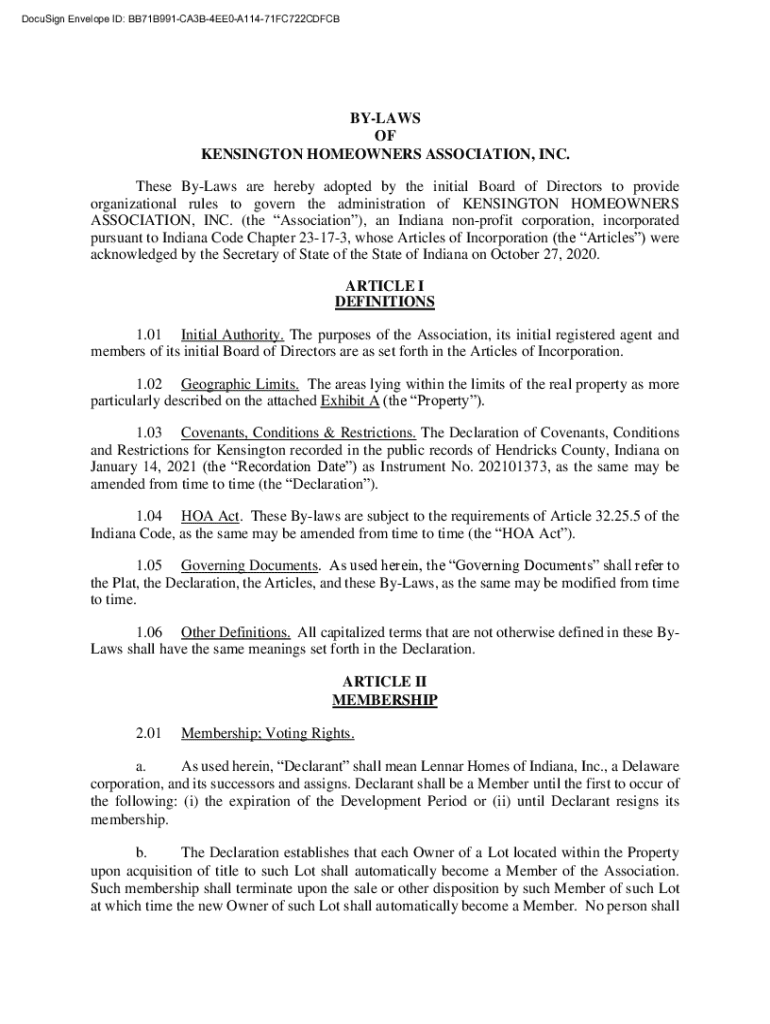 Get the free by-laws of Kensington Homeowners Association, Inc.